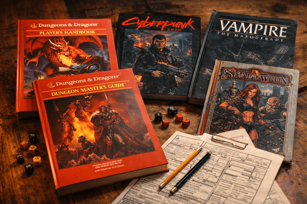 Nos anos 80, o RPG explodiu em popularidade graças a Dungeons & Dragons, que se tornou um fenômeno cultural. Era a época das grandes campanhas épicas, livros cheios de tabelas e imaginação sem limites.